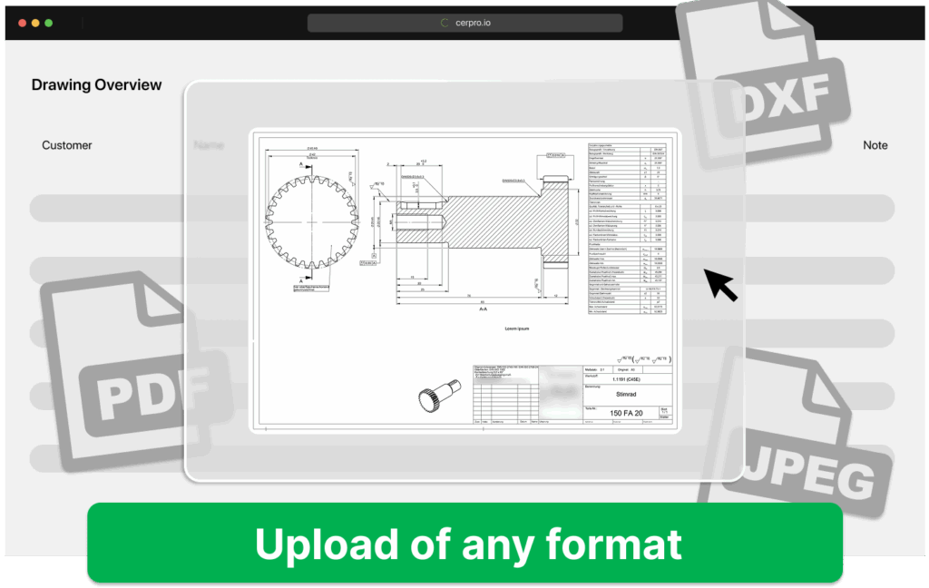 Upload technical drawings in any file format (PDF, JPG, DXF, etc.).